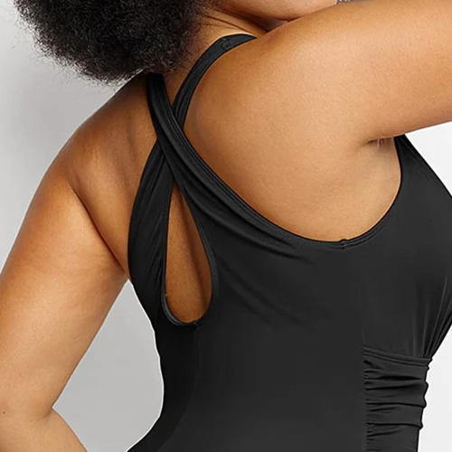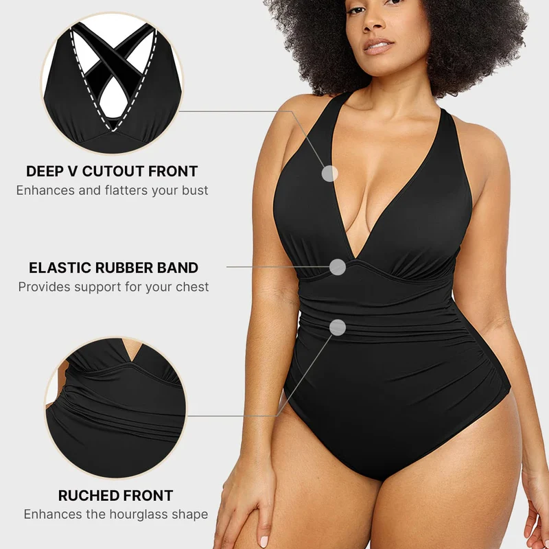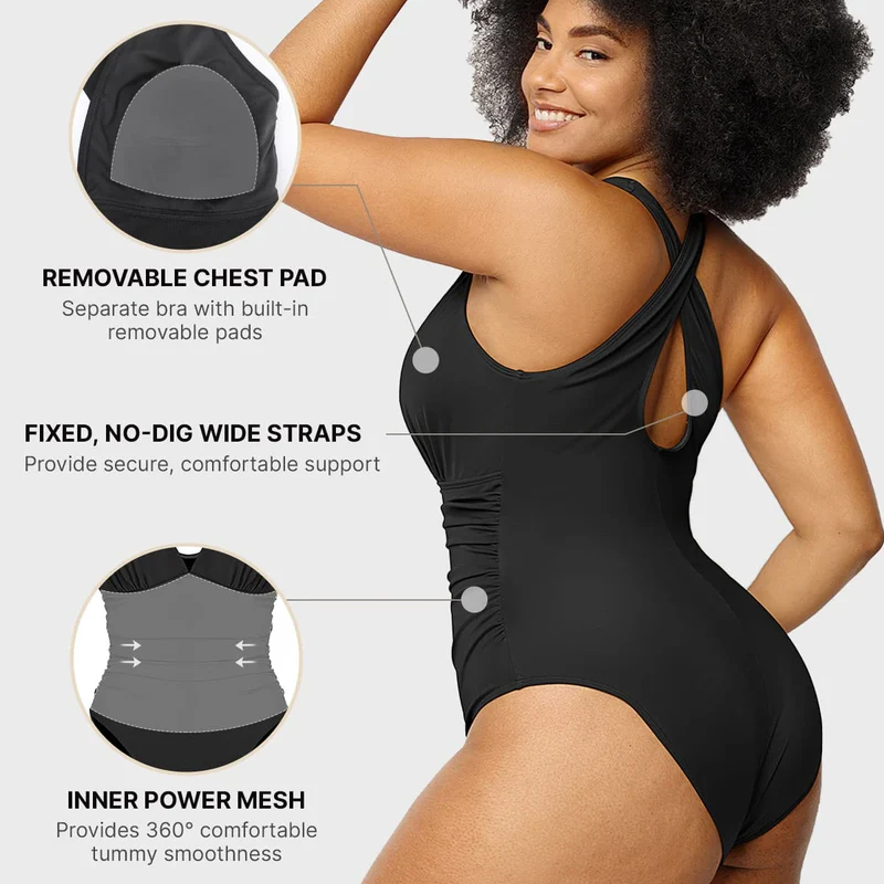 Featuresremovable padded bras,non-slip wide strapsfor a secure fit, full-coverage sides to prevent spillage, andruched abdomen detailingfor a sleek, elegant look—perfect for any occasion.