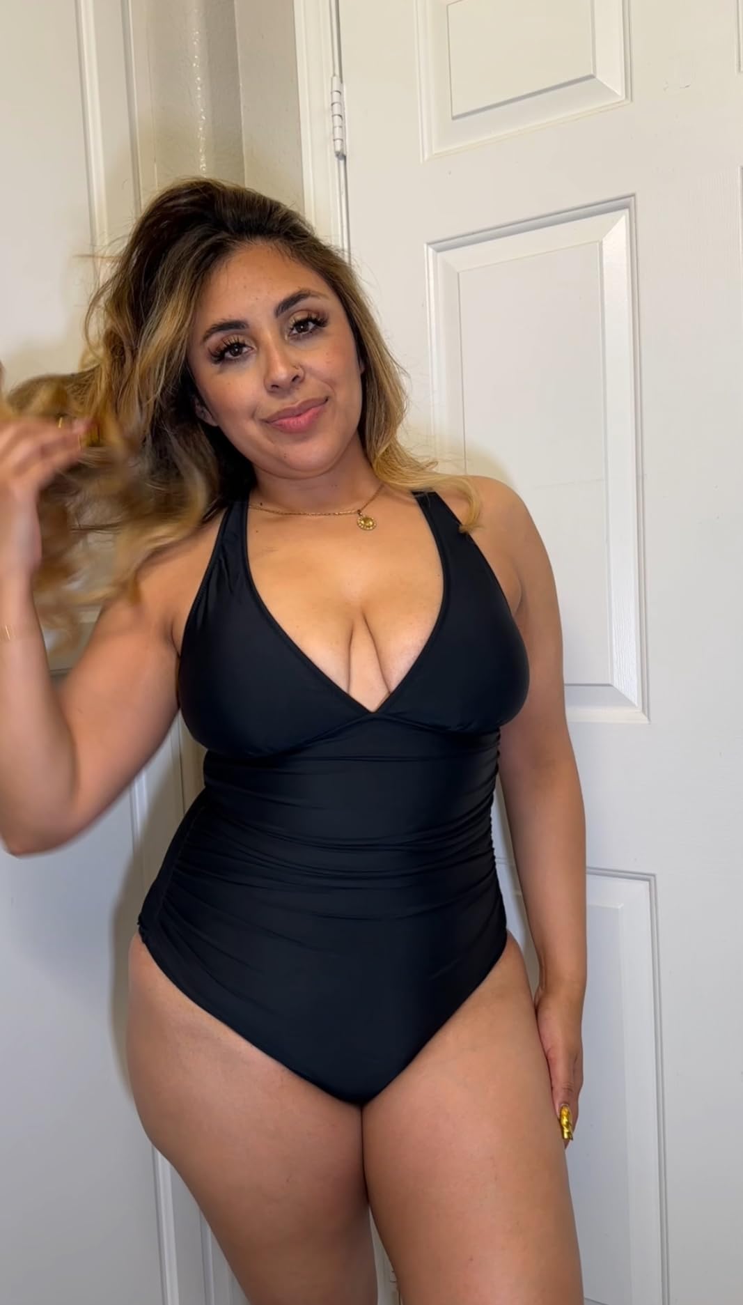 Double-layer fabricwith sun protection andhigh-compressioninner mesh for360° tummy controland a flattering hourglass silhouette.
